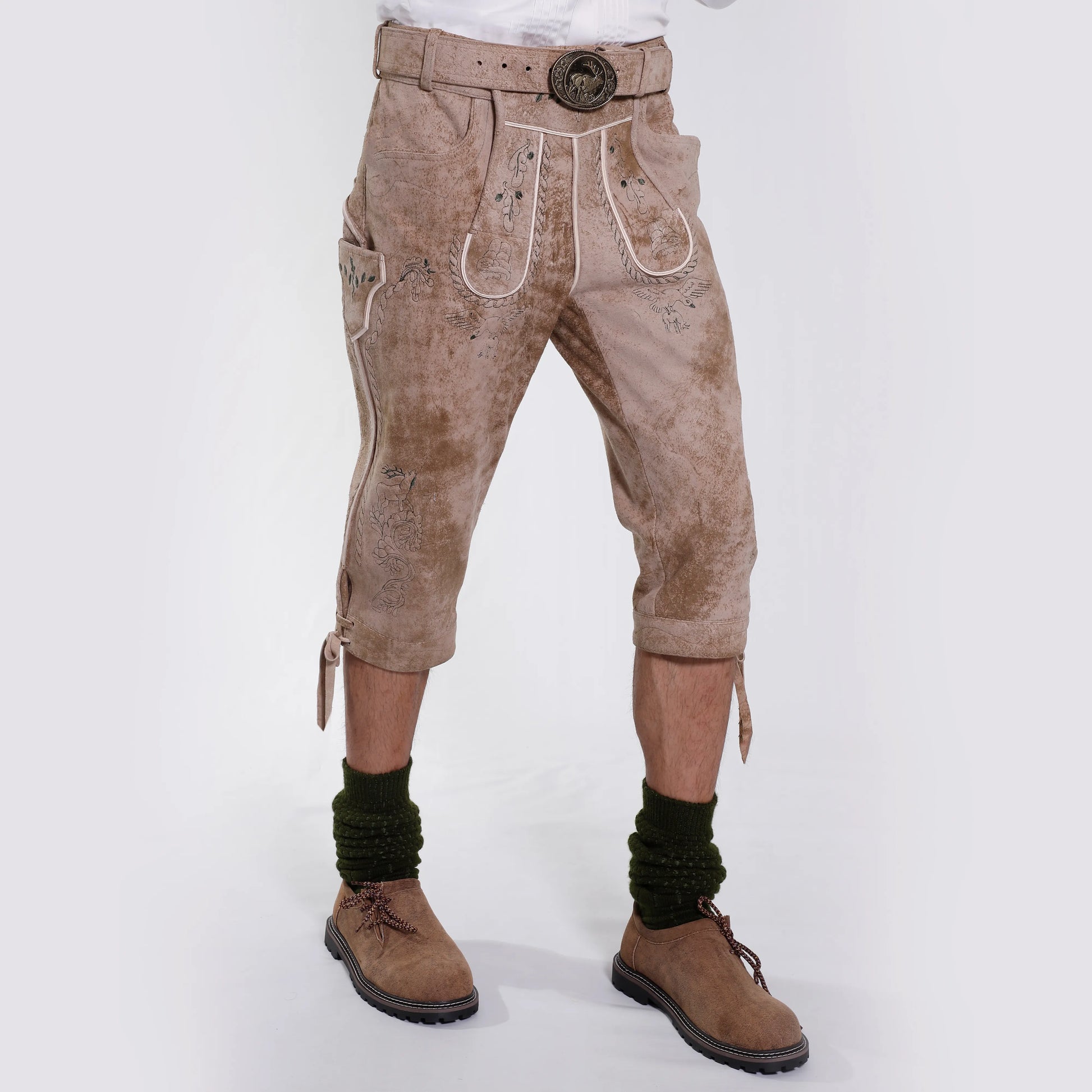 Bundhosen are typically made from leather or suede, with metal buttons and suspenders that allow for a comfortable and adjustable fit. The suspenders attach to the waistband with buttons, while the adjustable straps at the sides provide additional comfort and flexibility.