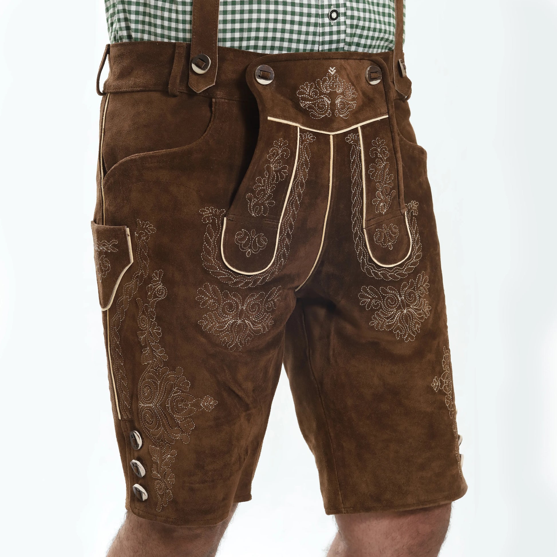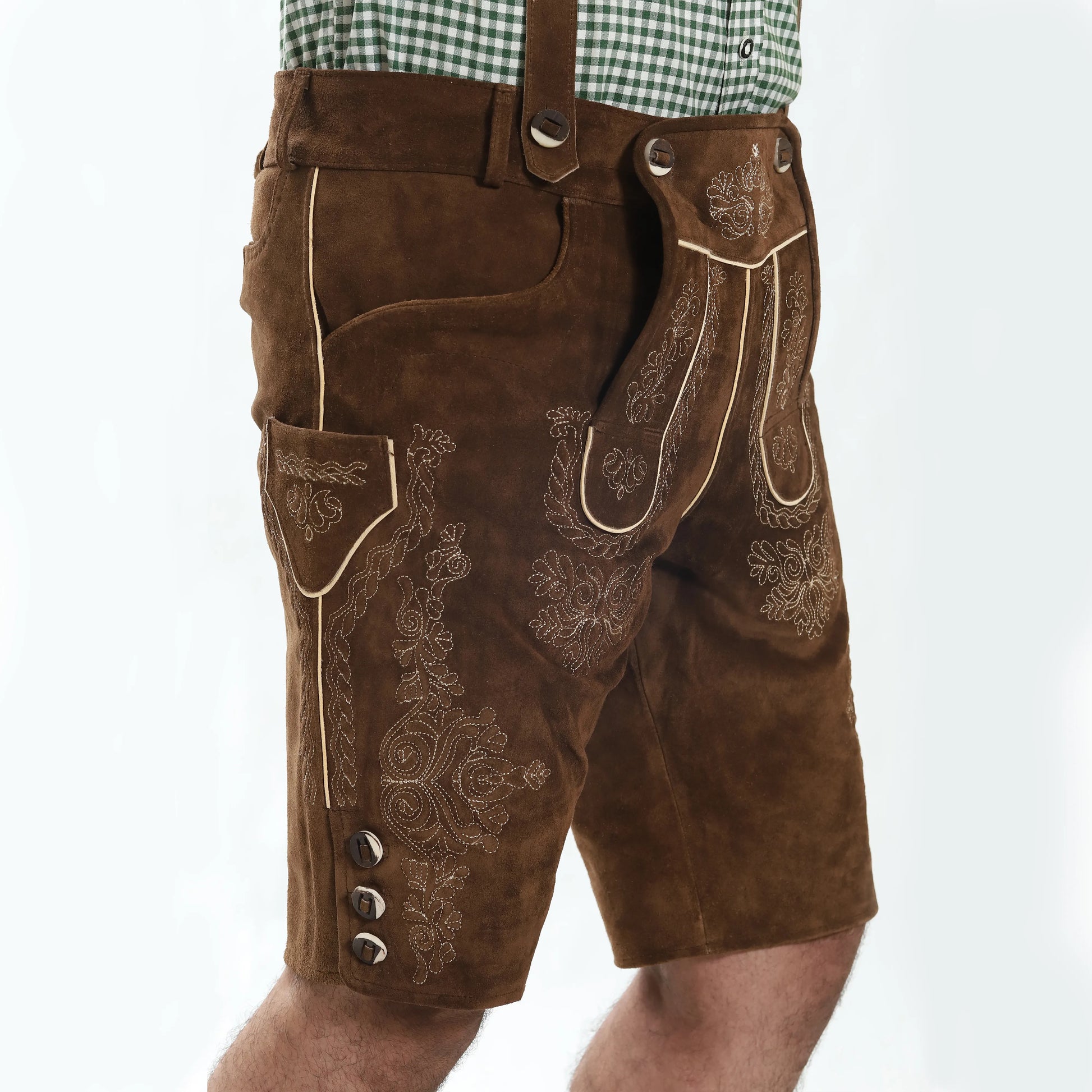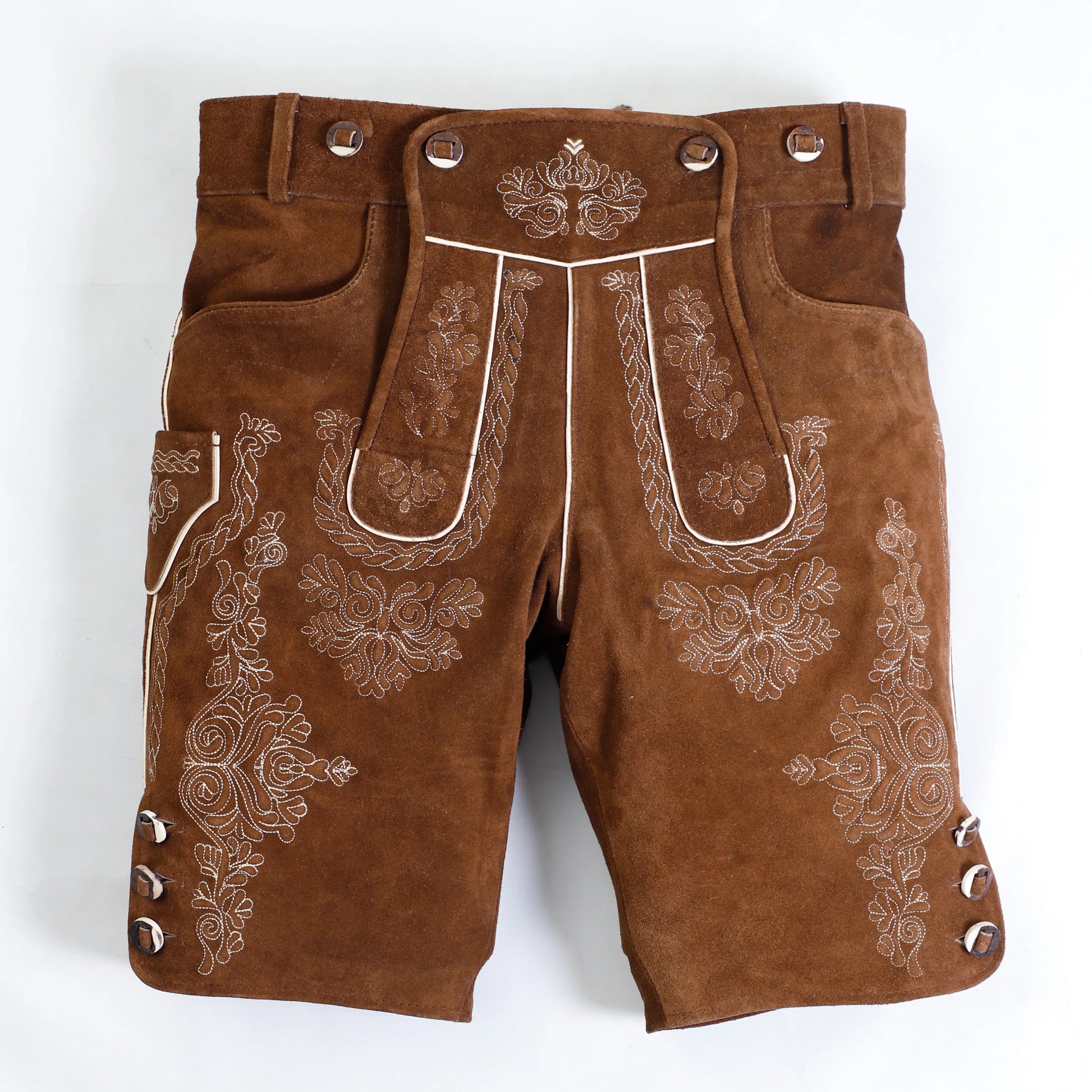 - Camel bone buttons add to the traditional charm of the lederhosen