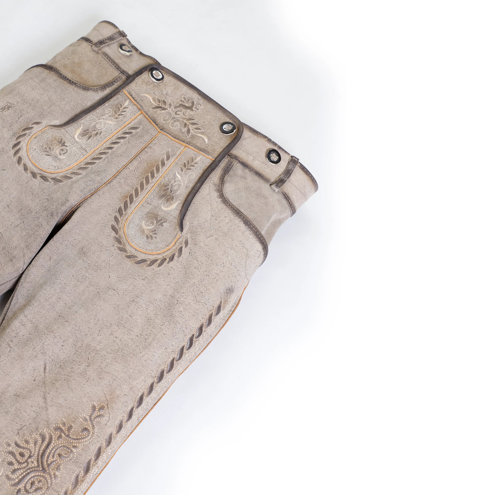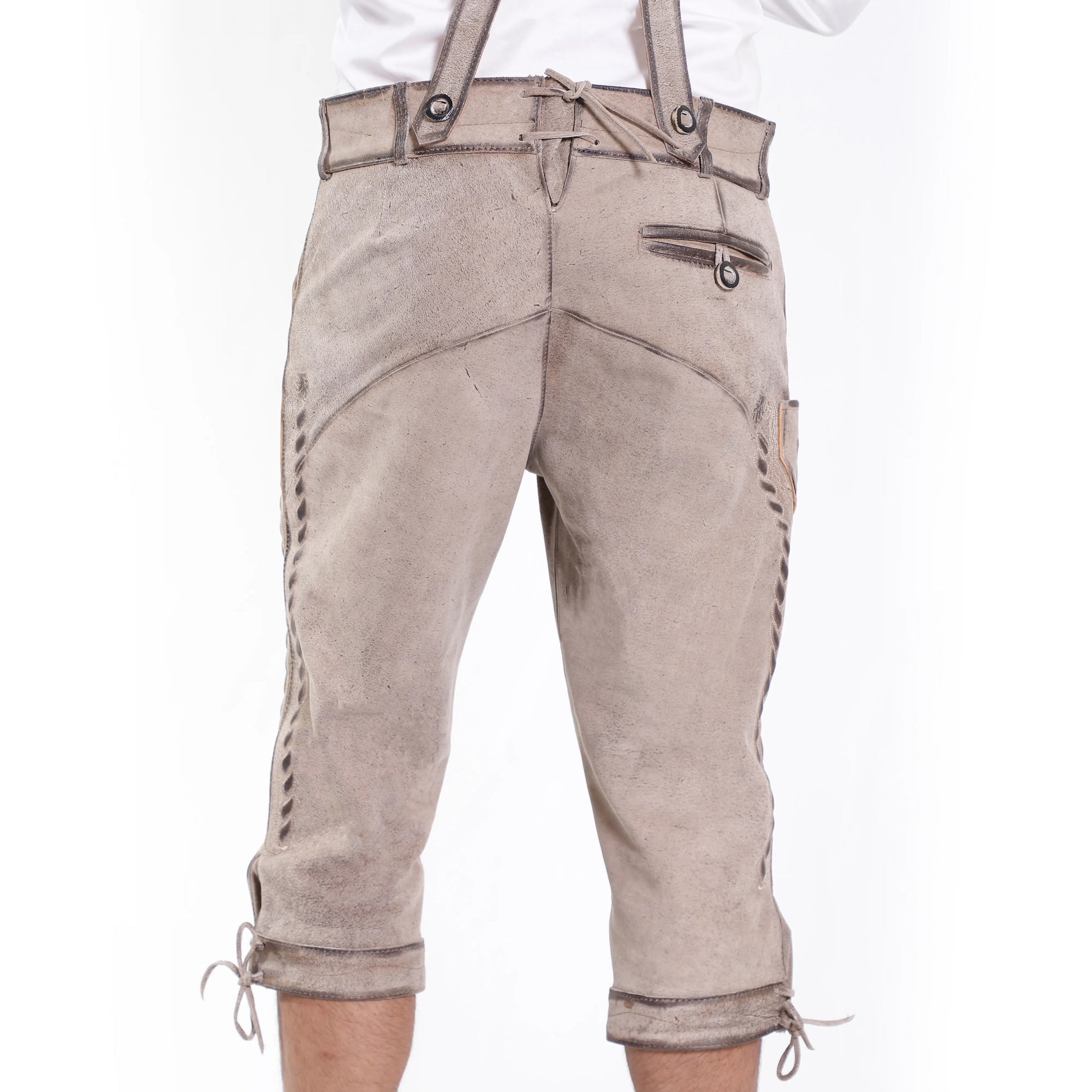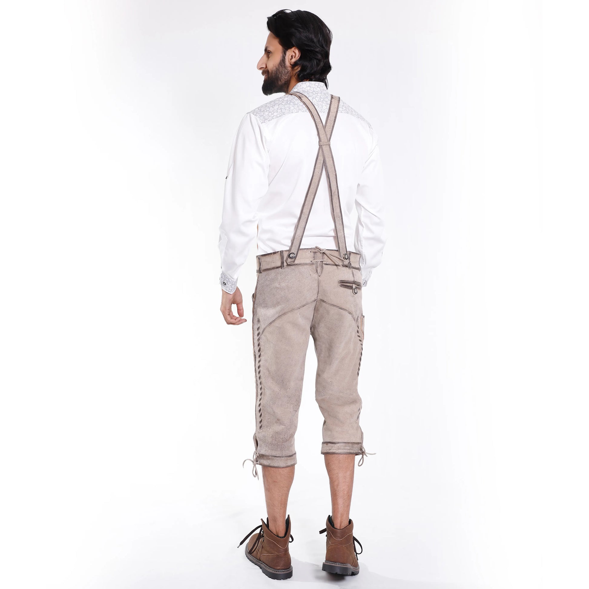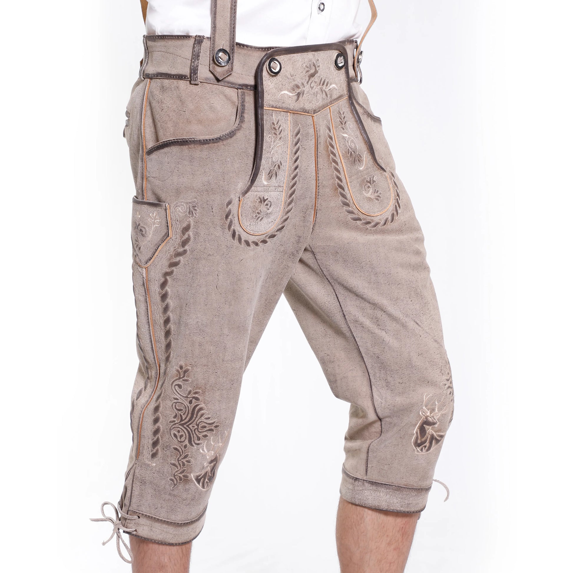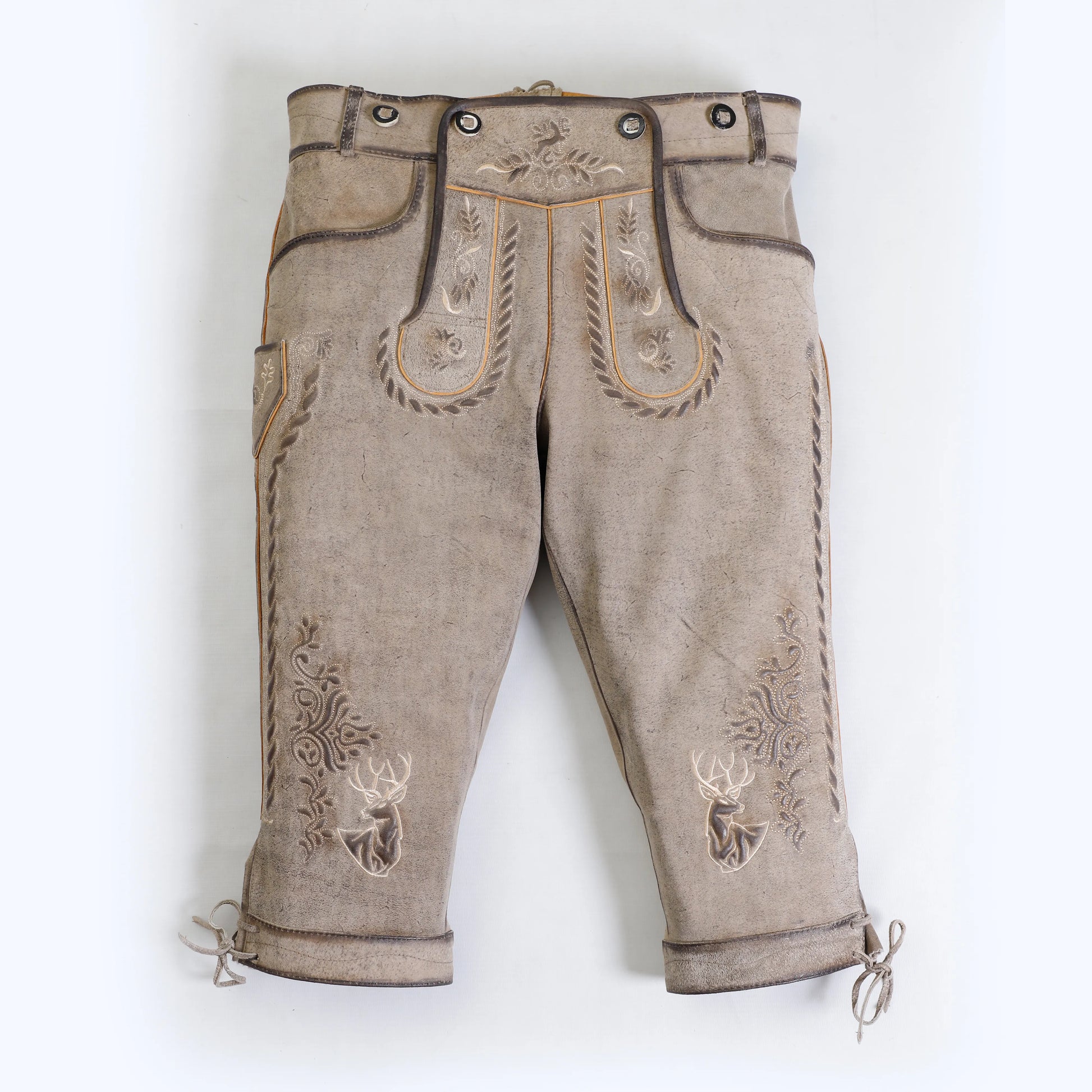 Bundhosen are typically made from leather or suede, with metal buttons and suspenders that allow for a comfortable and adjustable fit. The suspenders attach to the waistband with buttons, while the adjustable straps at the sides provide additional comfort and flexibility.